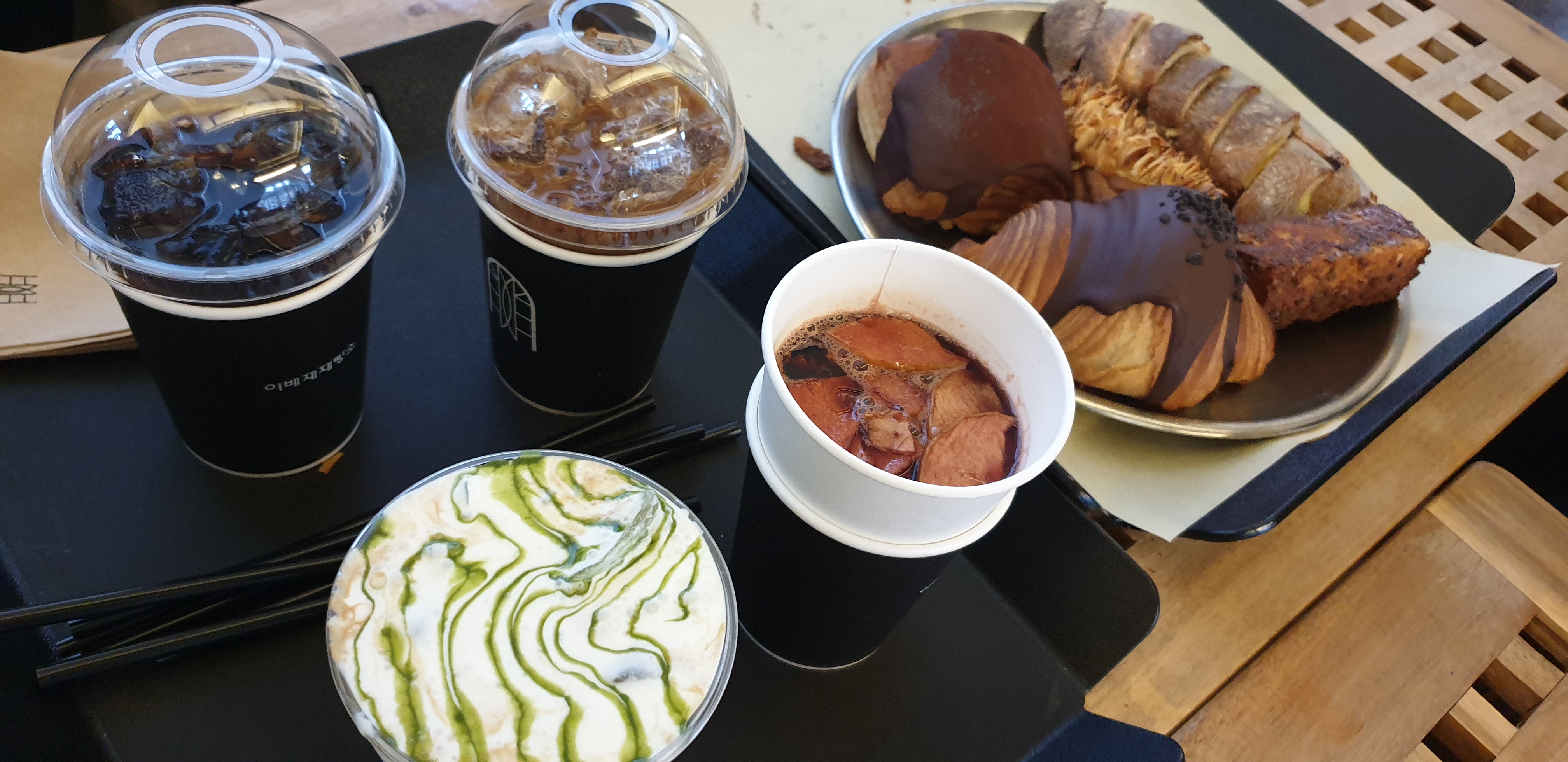 메뉴구성을 보면 가격대가 다른 카페에 비해 다소 비싸다 라고 생각이 들텐데요. 그건 팩트라고생각합니다. 카페 인테리어를 생각하여 자리값을 좀 받는다 생각하더라도 제빵 및 음료 가격은 다소 비싸다고 생각합니다. 그래도 맛있을 거라고 생각하여 저희는 빵 4개, 말차아인슈페너,뱅쇼,카페라떼,콜드브루 4가지 음료를 주문하였어요. 코로나바이러스가 심각해지기 전에는 예쁜 머그잔에 음료를 주었다고 하는데 요즘 위생적으로 민감한 시기라 그런지 1회용 테이크아웃 잔에 음료를 담아주는것은 알고 가시면 좋을 것 같습니다.