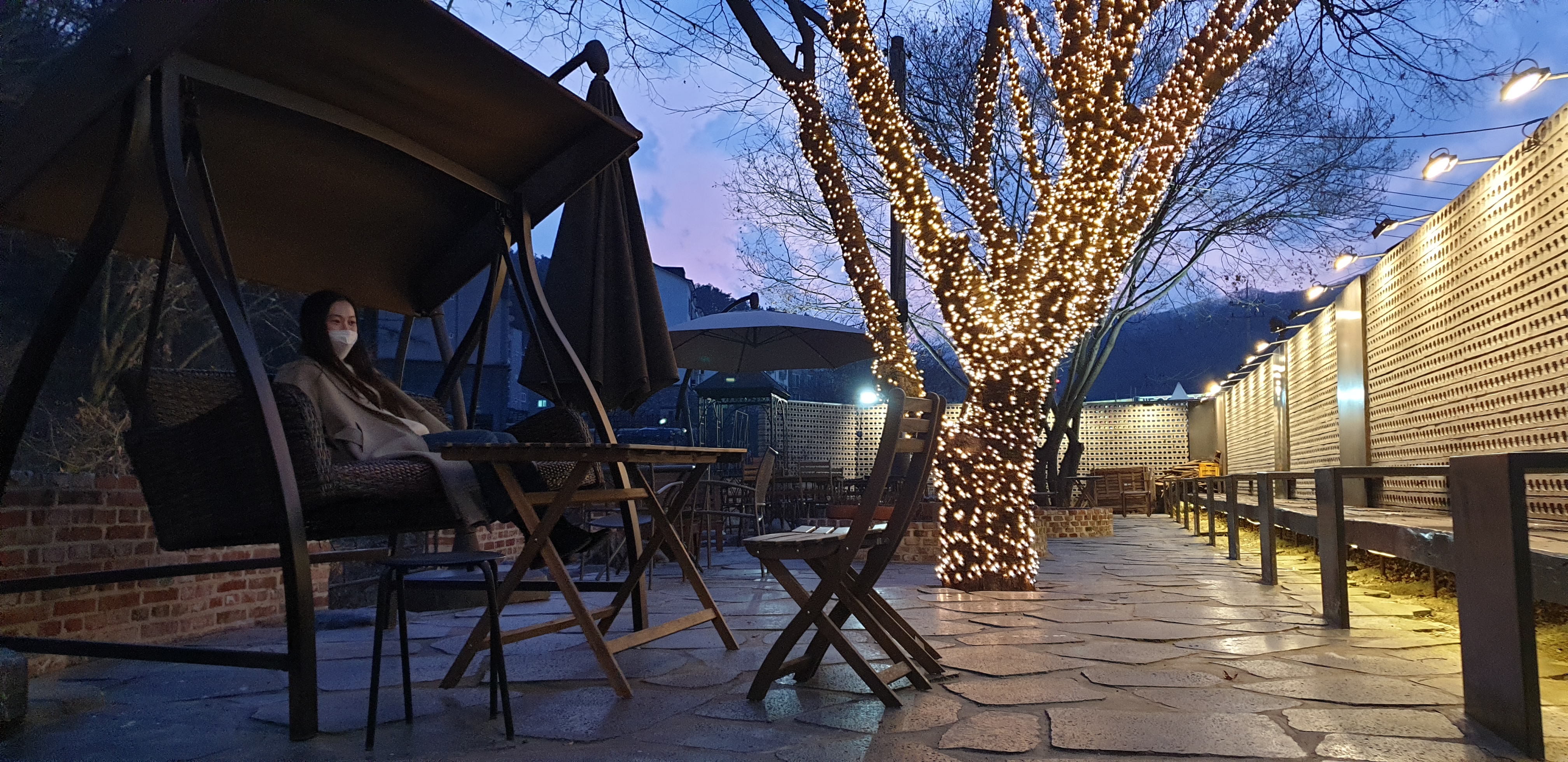 카페를 즐기고 밖으로 바로 나가는게 아니라 건물 뒤쪽으로 나오면 야외 테라스 또한 예쁜 조명으로 꾸며져 있었어요. 작년 12월의 경우 모닥불도 피워놓고 방석들이 구비되어있었다고 하는데 지금은 그렇게까지 손님이 많이오지 않아 방석구비는 되어있지 않고 모닥불 또한 없었지만 그네의자 옆으로 흐르는 시냇물 소리가 듣기 좋았어요.