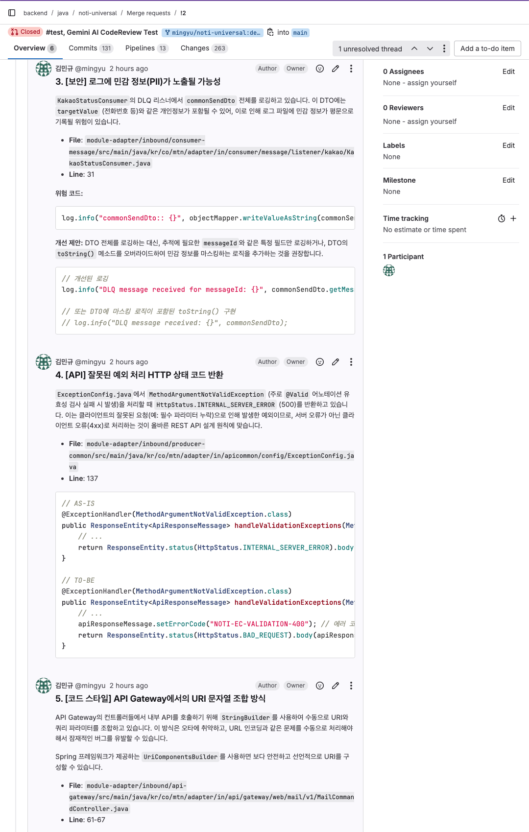 당신은 숙련된 코드리뷰어다. 아래 GitLab MR에 대해 간결한 요약과 개선 제안을 남겨라.