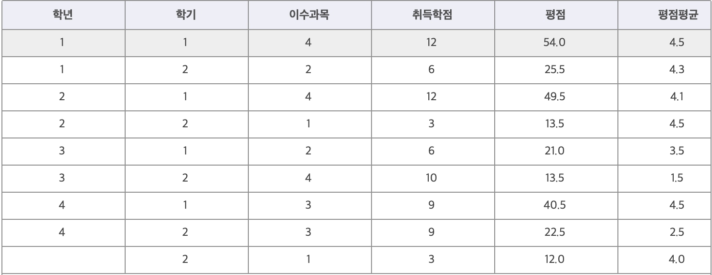 학기당 전공과목과 일반선택 및 교양과목을 적절하거 섞어 배분하여 학업을 진행하였고, 최대한 게으름을 피우지 않으려 노력하였습니다.
