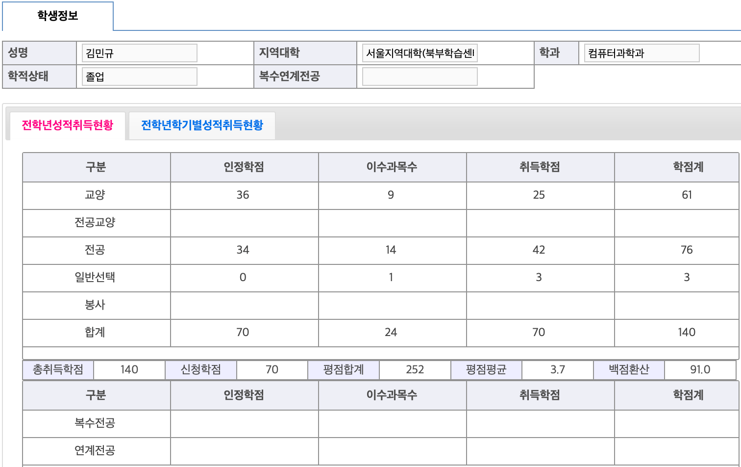 편입 인정학점은 70학점으로 졸업까지 필요한 학점은 총 70학점이었습니다.