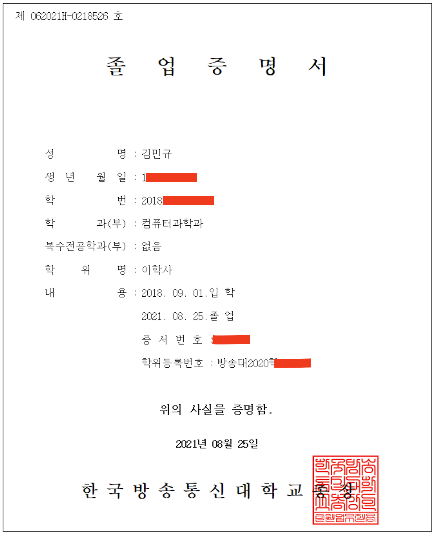 방송통신대학교 컴퓨터과학과를 졸업하며 [공학사]를 취득 할 줄 알았는데 졸업증명서를 확인해보니 [이학사]로 확인되었습니다.