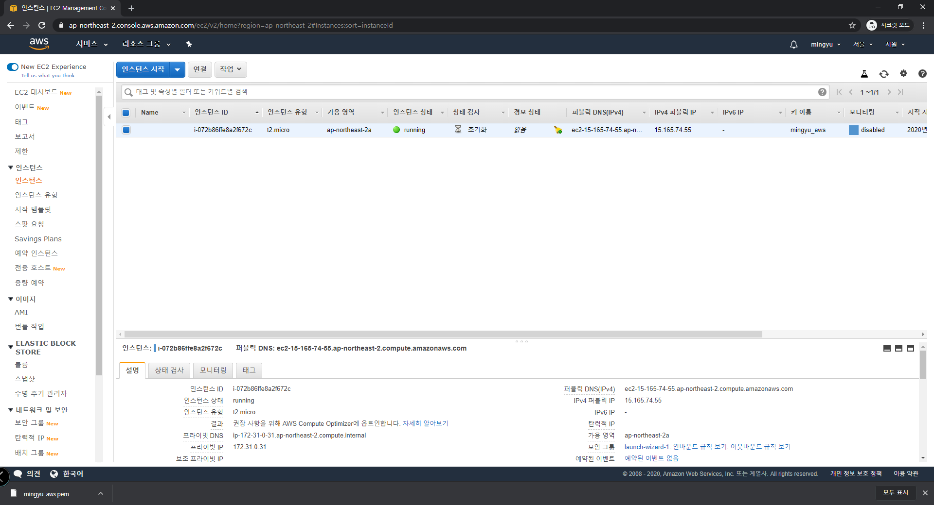 - AWS Management Console 밑에 EC2 대시보드를 클릭하면 본인이 만든 EC2 인스턴스를 확인 가능.