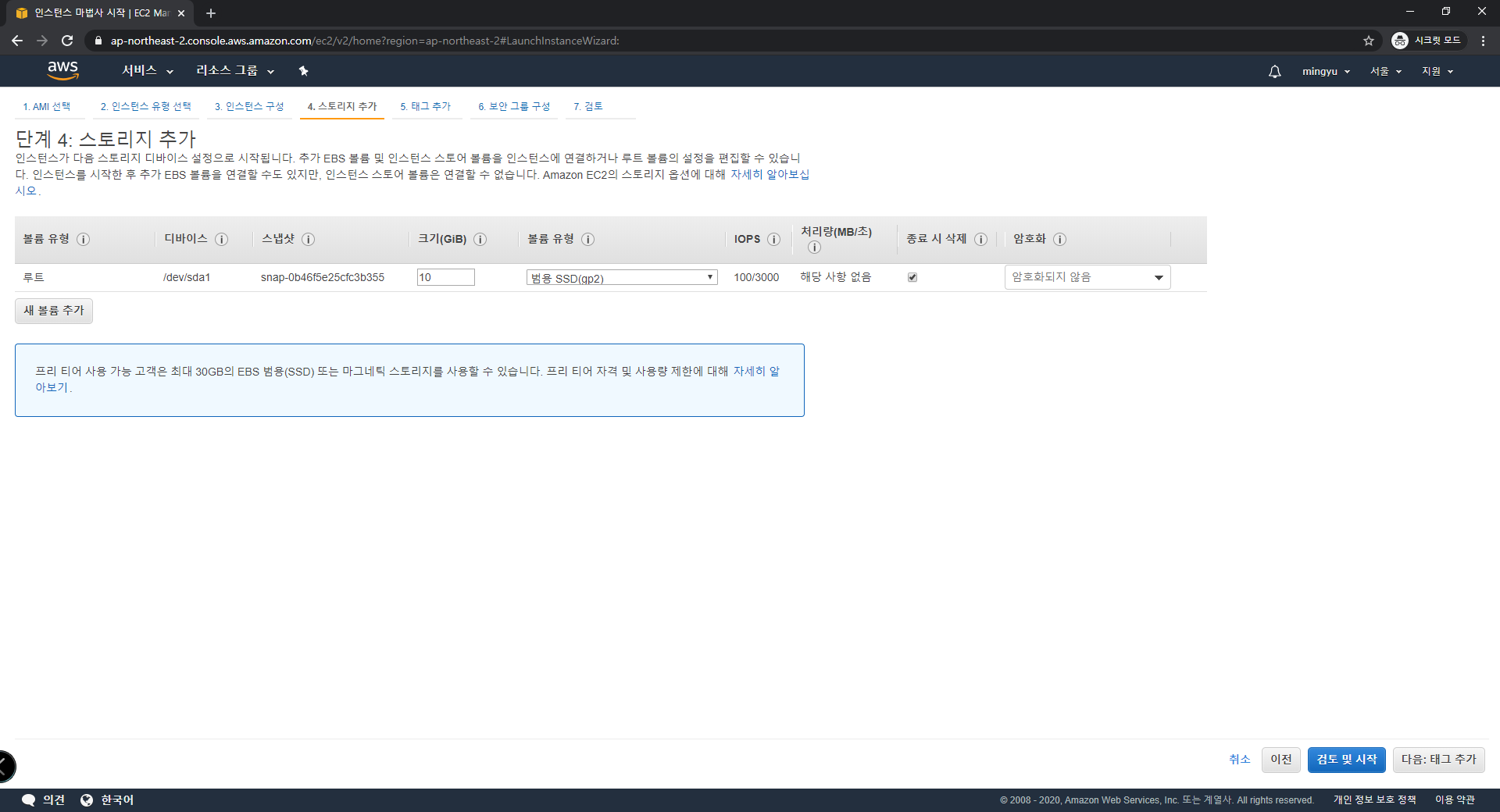 - 프리티어 사용 고객은 최대 30GB의 EBS볼륨(SSD) 또는 마그네틱 스토리지를 사용가능하다고 문구가 뜨는데