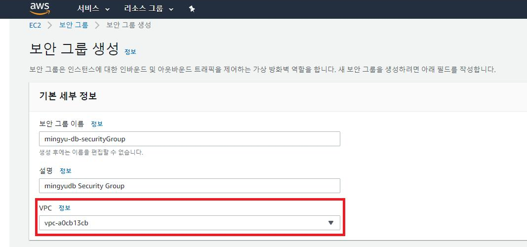 - 보안그룹 이름과 설명은 알아보기 쉽게 기입한다.