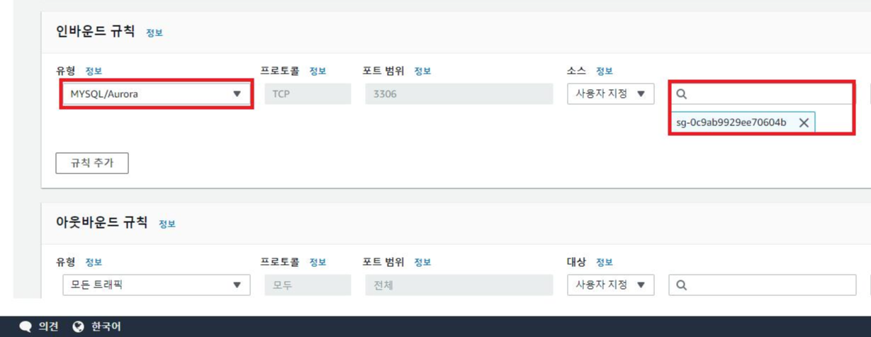 - 인바운드 규칙 추가 부분에서 필자는 mariadb, mysql을 사용하기 때문에 mysql/aurora 를 선택했다.