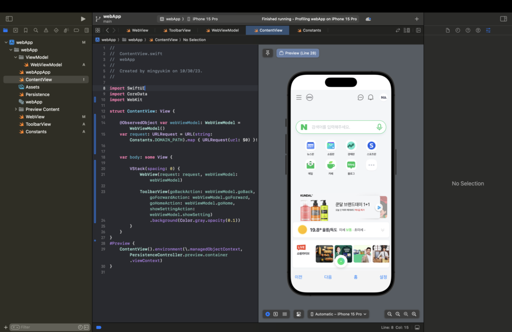 마지막으로 위에서 새로 생성 및 수정한 WebView와 WebViewModel, ToolbarView를 ContentView에 아래와 같이 그려주면 "설정" 버튼을 제외한 "뒤로가기","앞으로가기","홈이동" 버튼들이 정상적으로 작동하는것을 확인할 수 있다.