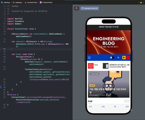 | [웹개발자의 IOS 탐방기] 2. 웹앱에 CustomToolbar 붙이기 (0) | 2023.11.08 |