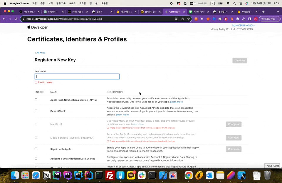 Apple 개발자 센터에서 Apple Push Notifications service (APNs) 관련 Key를 생성한다.