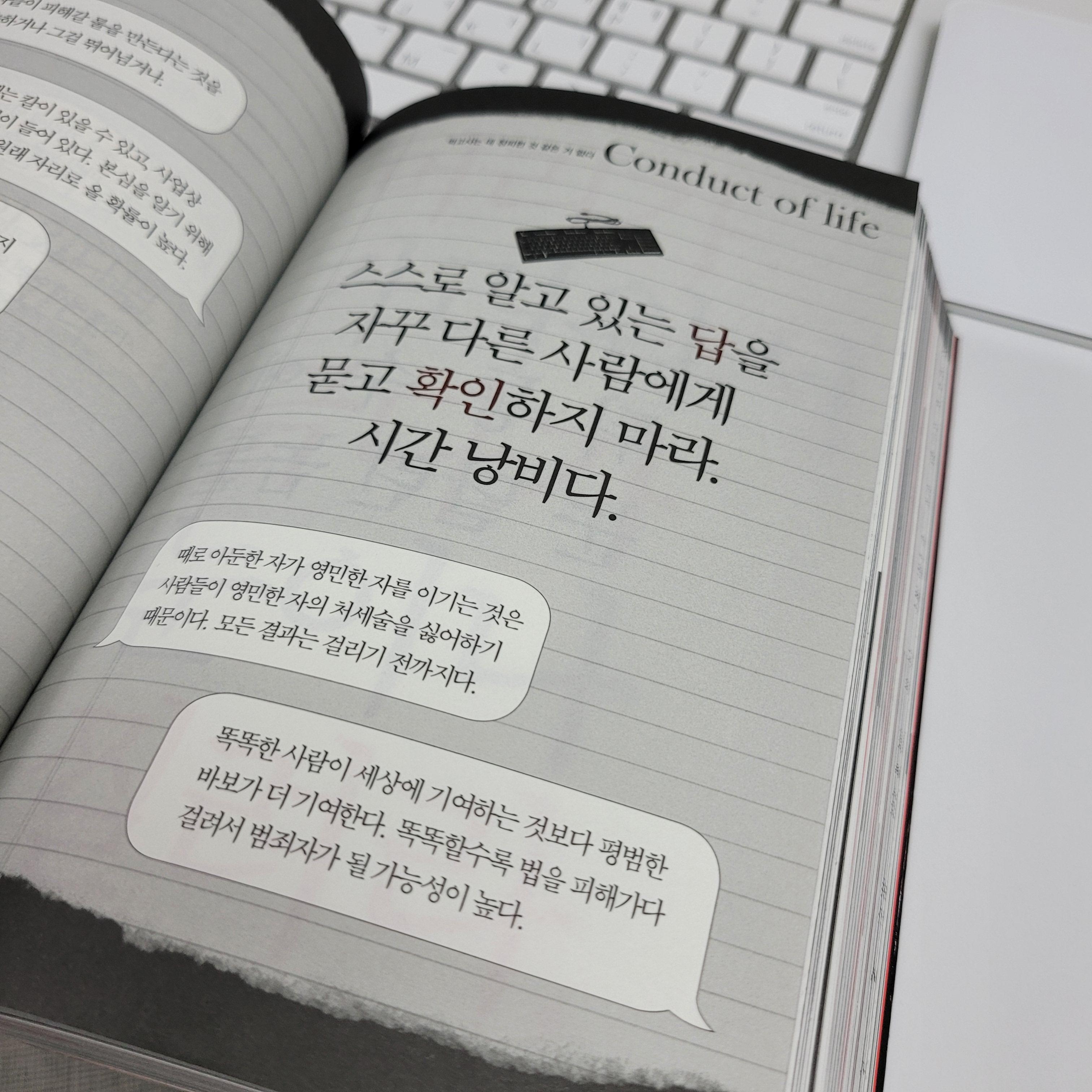 하나의 주제에 대해서 주절주절 빼곡하게 써져있는 흔한 자기 계발서가 아니라, 한 줄씩 툭 툭 던지는 따끔한 일침은 책을 한 장씩 넘길 때마다 나태해진 내 삶에 윤활유가 되어 불을 지피게 해 줬다.