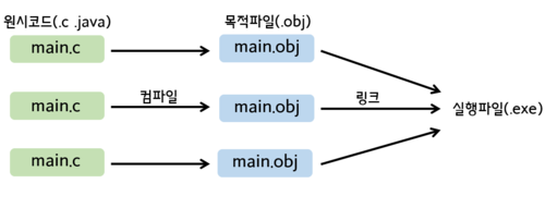 위에서 설명한 Compile로 생성된 목적파일(.obj 등)만으로는 프로그램을 실행할 수 없다. 보통 사람들은 위에서 설명한 컴파일(Compile)이 원시 코드(. c or .java 등)에서 바로 실행파일(.exe 등)로 변환되는 것이라고 생각하지만, 이것은 컴파일러가 하는 역할일 뿐 컴파일 (Compile)이 아니다. 컴파일이라는 개념은 위에서 설명한 대로 원시 코드에서 목적 파일로 바꾸는 것일 뿐이다.