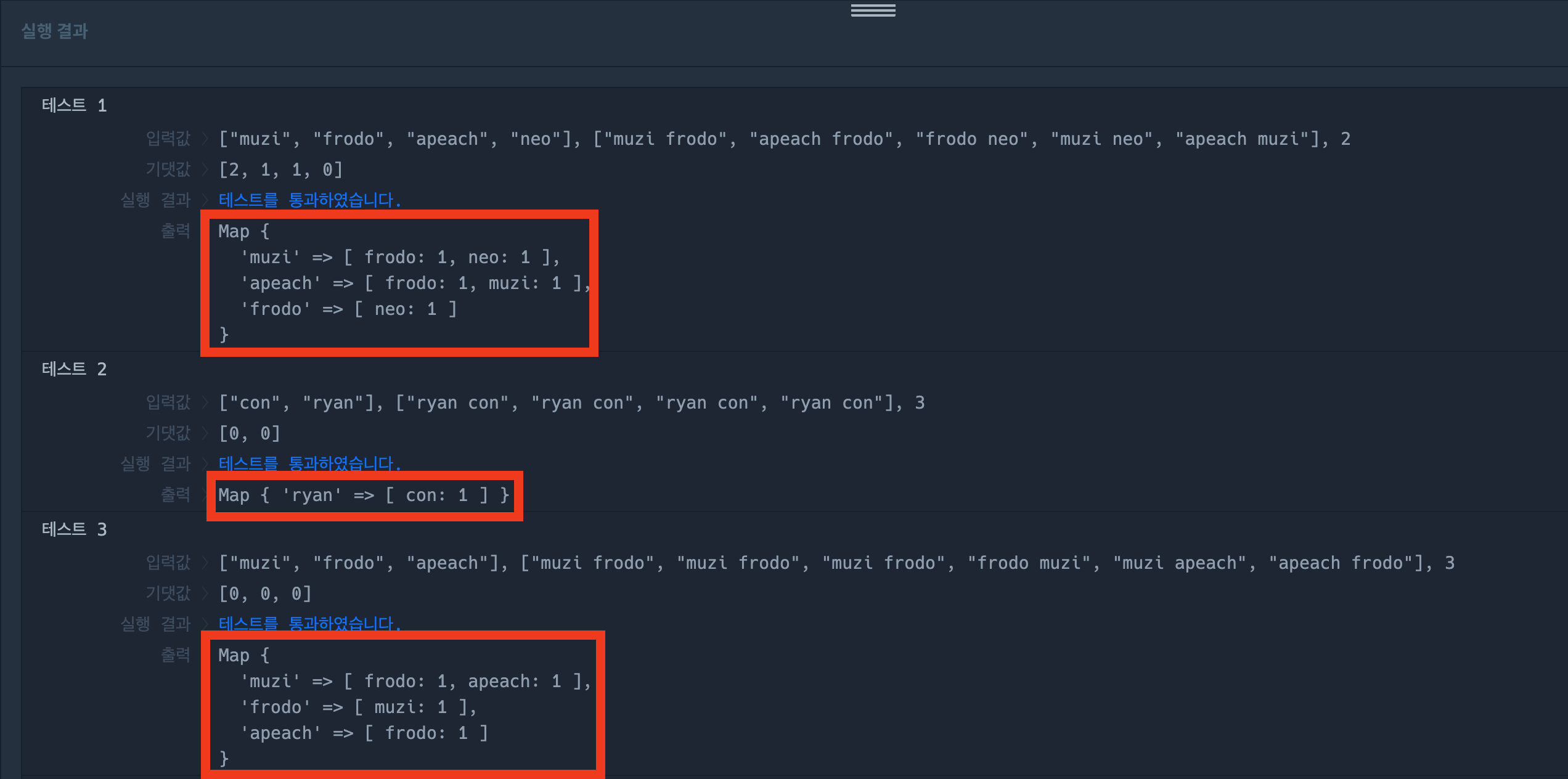 | ["muzi", "frodo", "apeach", "neo"] | ["muzi frodo","apeach frodo","frodo neo","muzi neo","apeach muzi"] | 2 | [2,1,1,0] |