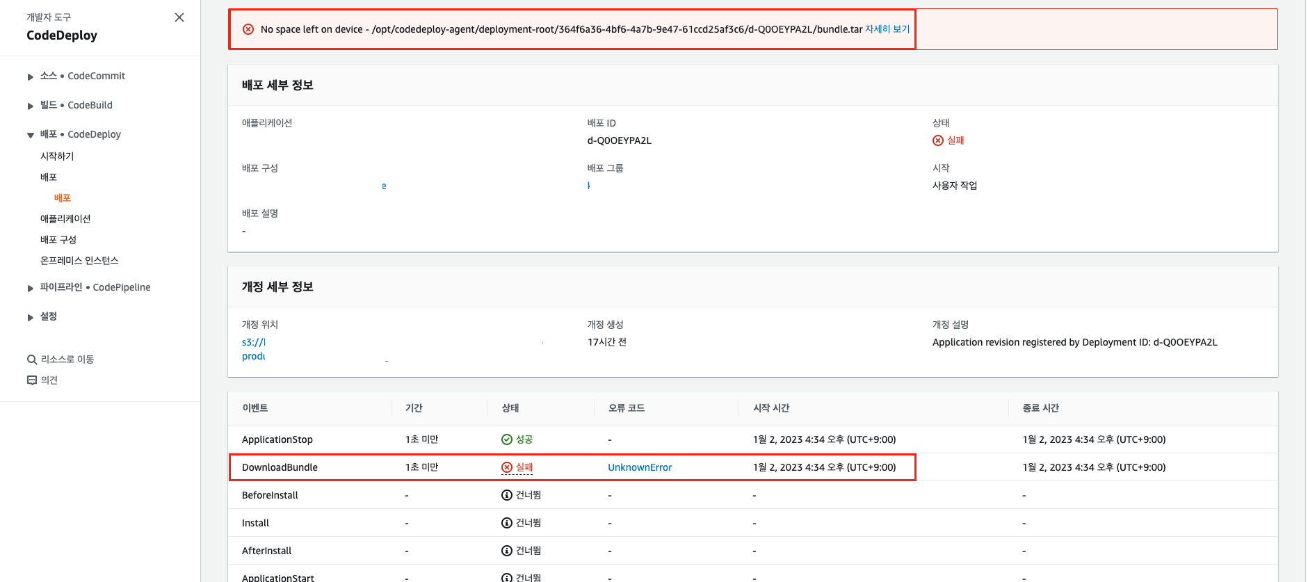 하지만 나도 년차가 쌓여서 그런지, 당황은 뒤로 미뤄두고 좀 더 상세한 에러 로그를 확인하기 위해 세부 정보를 확인해 봤다. 아래와 같은 에러 메시지를 첫 번째로 확인할 수 있었는데 배포 그룹 설정이나 ec2 인스턴스에 특별한 문제는 없어 보였다.