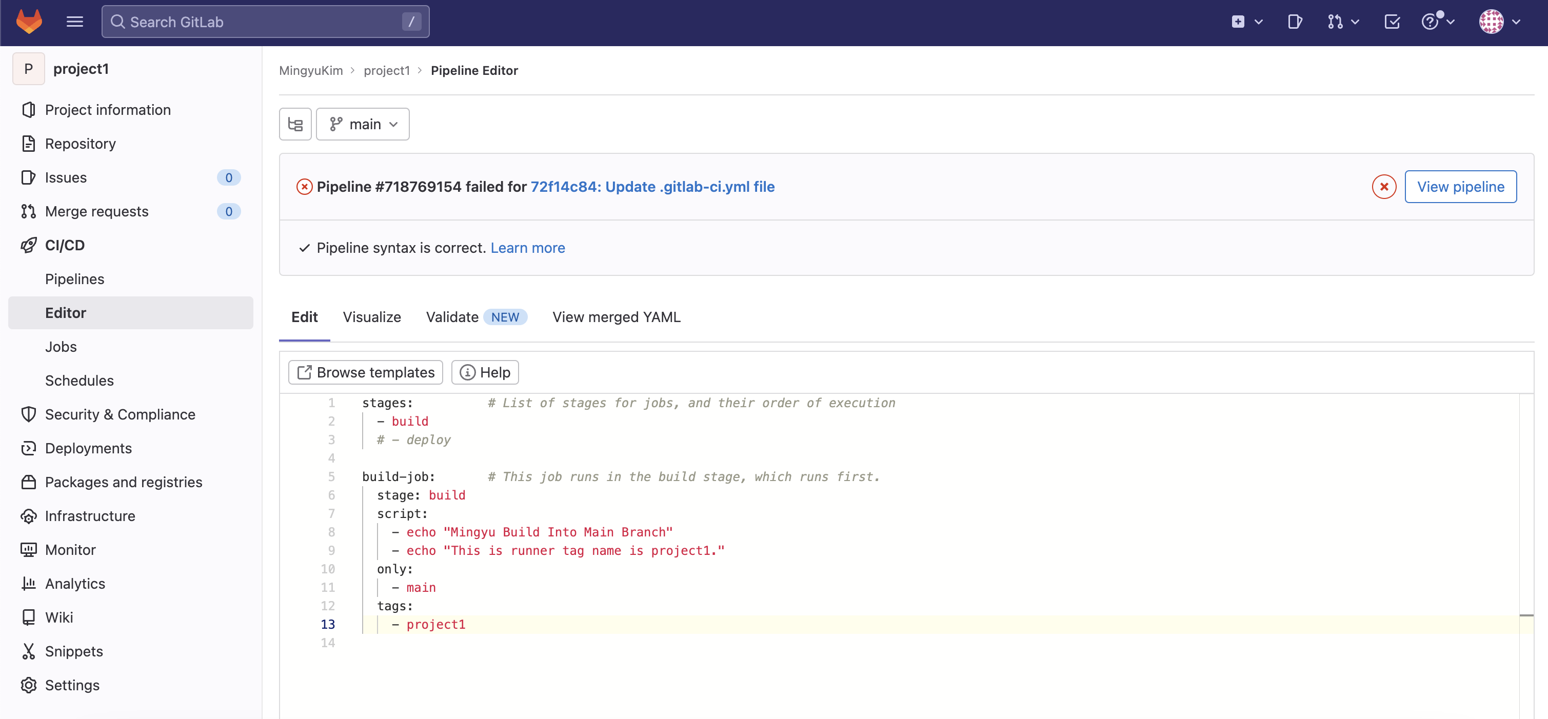 4. 생성했던 GitLab project에서 gitlab-ci.yml 내용 변경 및 push 후 build-job 확인하기