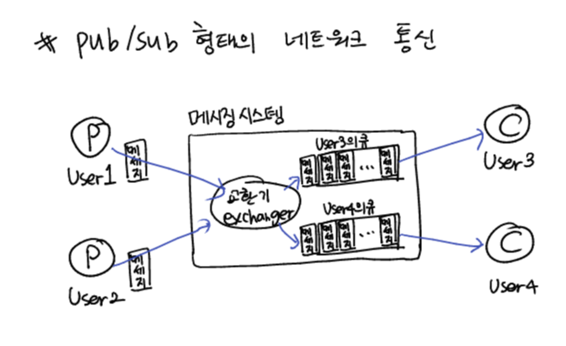 아파치 카프카는 위의 단점들을 해결하기 위하여 프로듀서가 메시지를 컨슈머에게 직접 전달하는 Point to Point 방식이 아니라, 중간의 메시징 시스템에 전달하여 메시징 시스템의 교환기가 수신처 ID값을 통하여 컨슈머들의 큐에 메시지를 전달 (Push) 하는 방식으로 개발되었습니다. 떄문에 특정 개체가 수신불능 상태가 되더라도 메시징 시스템만 살아있다면 메시지 유실의 위험이 없으며 메시징 시스템으로 연결되어 있기 때문에 확장성에 용이합니다. 다만 중간에 메시징 시스템을 거쳐가기 때문에 속도가 빠르진 않고, 직접 통신하지 않기 때문에 메시지의 전달유무를 파악하기 힘든 단점이 존재합니다.