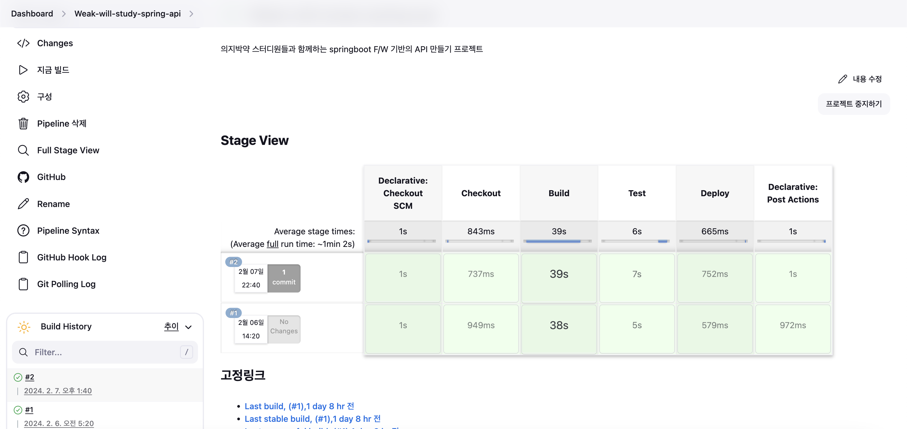 'Deploy' 스테이지에서는 sh 스크립트를 사용하여 빌드된 JAR 파일을 ~/deploy/ 디렉토리로 복사하고, 현재 시간을 deploy.txt 파일에 기록하게 한다. 이는 배포의 일환으로 application을 컨테이너화 시킬때 사용할 것이다.