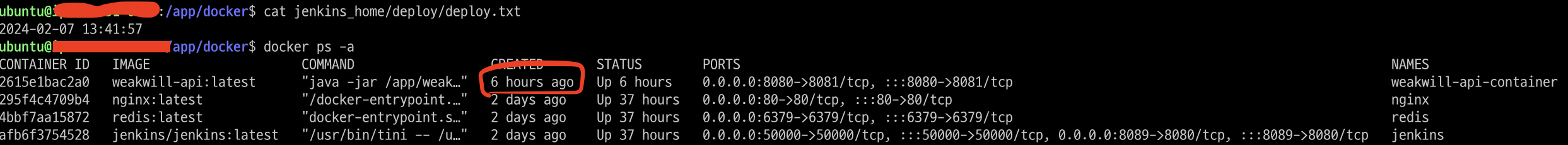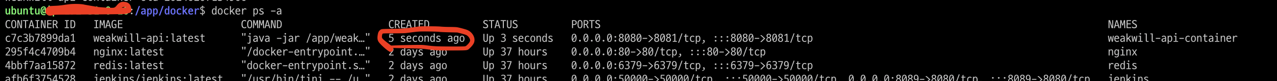afb6f3754528 jenkins/jenkins:latest "/usr/bin/tini -- /u…" 2 seconds Up 37 hours 0.0.0.0:50000->50000/tcp, :::50000->50000/tcp, 0.0.0.0:8089->8080/tcp, :::8089->8080/tcp jenkins