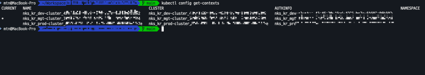 저는 nks를 사용하고 있고, ncp의 ncp-iam-authenticator을 설치하여 dev, mgt, prod 각 클러스터의 kubeconfig파일을 만들어서 하나로 merge 시킨 merged-kubeconfig.yaml 파일을 가지고 있다는 전제하에 포스팅을 이어가겠습니다. NKS를 사용 중이신 분들은 링크의 내용을 토대로 kubeconfig파일 생성에 참고하시기 바랍니다.