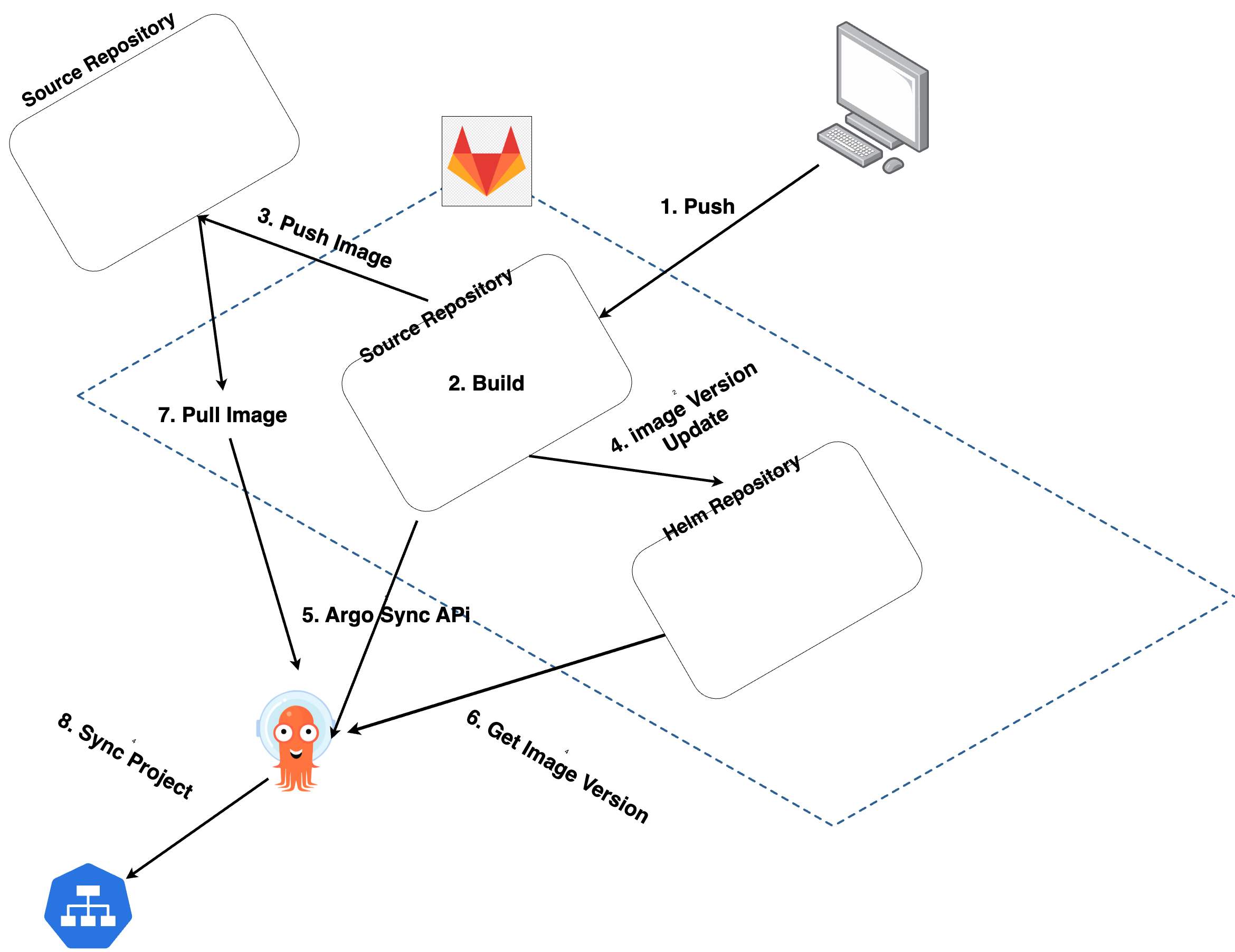 GitlabCI에서는 이전 포스팅에서 설명한 대로, Application을 Build 하여 Conatiner Image로 만든 후 Docker Image Registry인 NCP Container Resitry에 Upload 합니다. 그 후 helm repository에 Image Tag값을 변경해 주면 ArgoCD의 Sync 옵션이 Auto일 경우 OutOfSync일 경우 helm repo와 자동으로 Sync 하여 배포를 완료해 주지만, 저의 경우 Sync 옵션을 Manual로 지정하였기 때문에 GitlabCI에서 ArgoCD의 Sync API까지 호출해 주도록 합니다.
