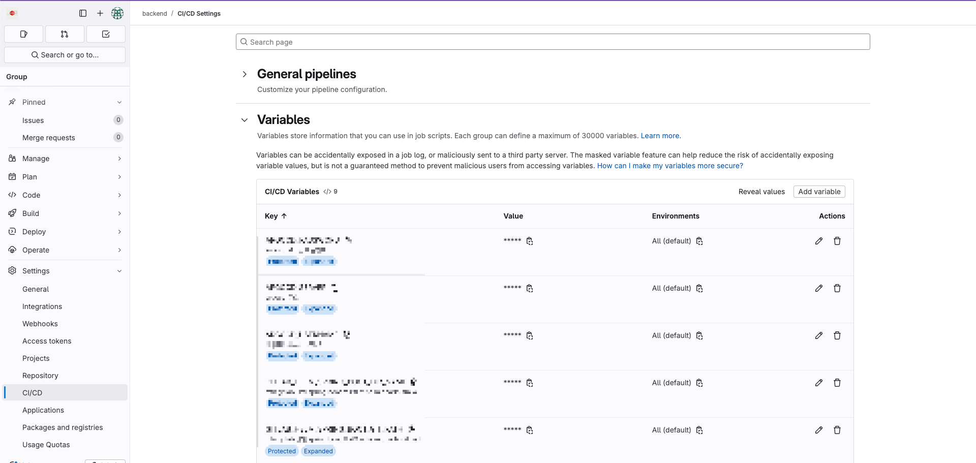 script 태그에서 해당 stage에서 처리해야 할 작업들을 기술하여 처리하도록 합니다. 필요한 Variables들은 GitLab Settings > CI/CD > Variables에서 설정 및 관리할 수 있습니다.