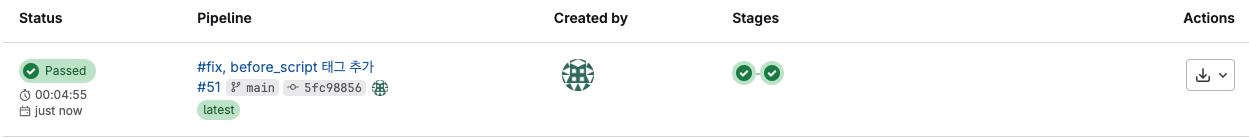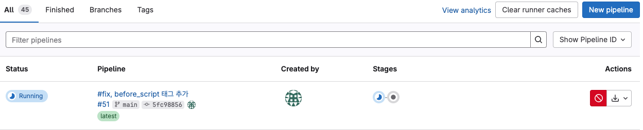 commit & push를 진행하면 gitlab PipeLies에서 작업 내역을 아래와 같이 확인할 수 있습니다.