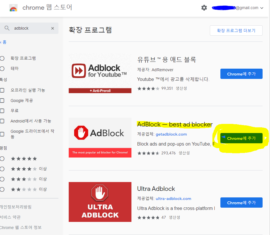 - Chrome 웹 스토어 에서 adBlock 을 검색한다.