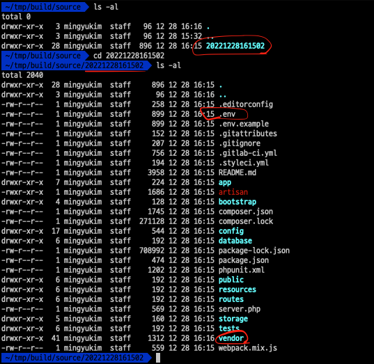 여기서 주의할 점은 최신화 된 source code는 .git 파일(해당 프로젝트에 연결된 git 설정들)을 포함하고 있기 때문에 .git 파일은 지운 후에 배포해야 한다. 때문에 위에 코드를 잘 보면 rm -rf 명령어로 .git을 삭제 한 후에 build 관련 작업을 실행하게 했다.