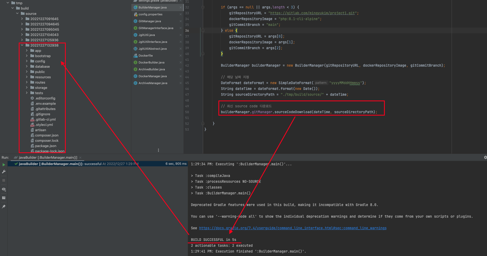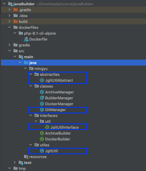 이제 위에서 만들어놓은 GitManager 및 앞으로 만들 모든 Manager Class의 기능을 컨트롤 할 Main Class인 BuilderManager Class를 만든다. 내용은 간단하다. 나는 최근 테스트용도로 만들어놓은 "https://gitlab.com/mingyukim/project1.git" 프로젝트를 예시로 사용했다. 해당 프로젝트는 Laravel Framework로 만들었기 때문에 나는 Build시 사용할 도커 이미지를 내가 공부하며 만들어놓은 mingyu94/php8.1:0.5(php 8.1 및 버전에 맞는 자주 사용하는 php 확장 프로그램을 미리 설치해서 이미지로 만들어 개인 docker hub에 사전에 배포해 놓은 이미지) 를 사용할 것이다.