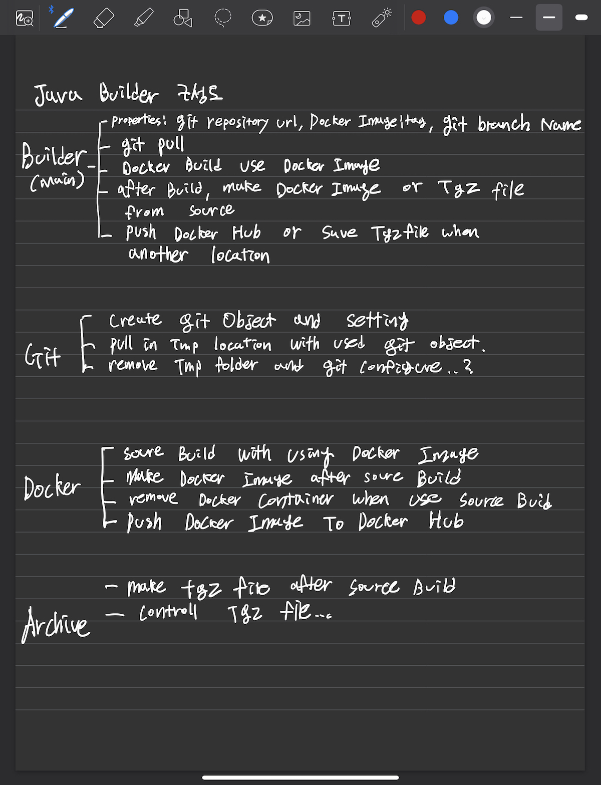 원하고자 하는 기능들만 나열했을 경우 크게 BuilderClass, GitClass, DockerClass, ArchiveClass 4가지의 메인 Class(Controller)가 필요하다. 각각의 Class는 특정 기능들을 담당하게 되고, Main method가 있는 Builder Class에서 다른 클래스들을 사용하여 전반적인 Build 작업을 실행하게 한다.