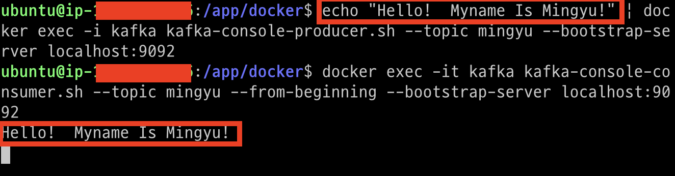 echo "Hello! Myname Is Mingyu!" | docker exec -i kafka kafka-console-producer.sh --topic mingyu --bootstrap-server localhost:9092
