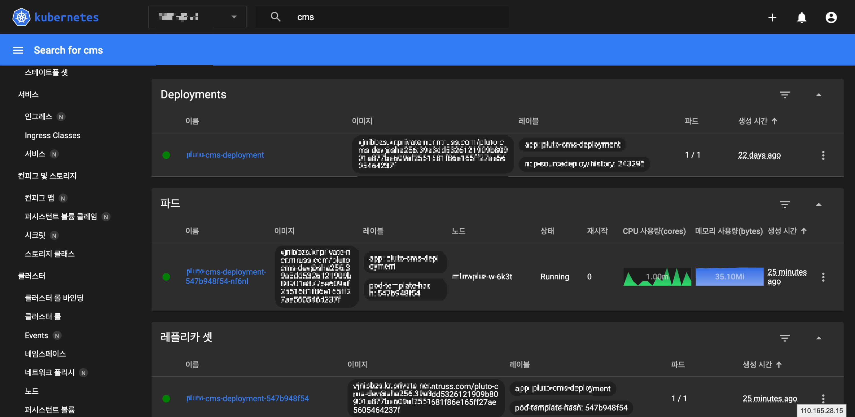 k8s cluster 대시보드에 접속하여 해당 이미지로 디플로이먼트가 잘 되었는지 체크해봅니다.