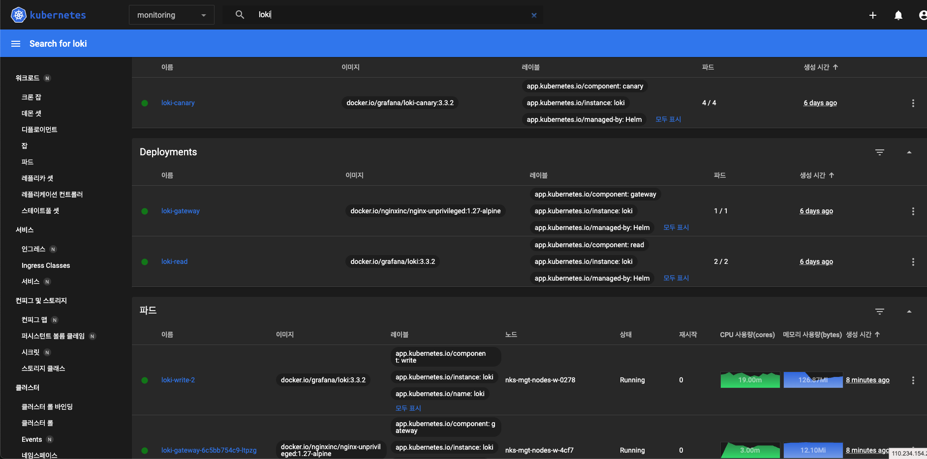저는 mgt-cluster의 monitoring 네임스페이스에 로키를 설치했는데, 계속 오류가 발생했습니다. 이유를 살펴보니 loki 설치시 default dnsService가 "kube-dns"로 되어있는데, NKS의 dnsSerivce는 "coredns"라는 명칭이기 때문이었습니다. 때문에 global dnsService값을 변경해줍니다. 또한, ipv6를 사용할 필요성이 없기 때문에 gateway의 nginxconfig도 변경해줍니다.