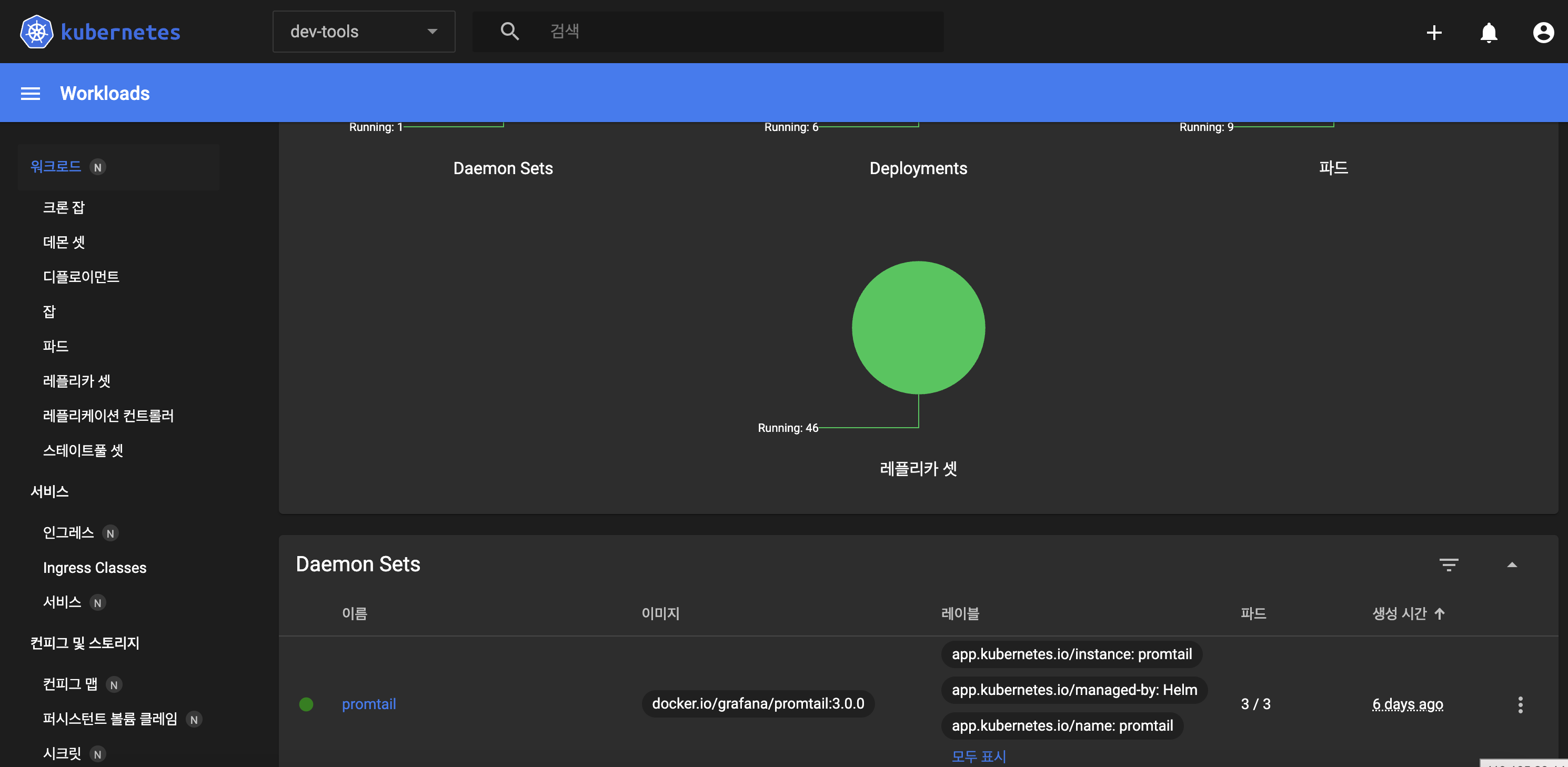 그 후, helm 명령어를 통해 수정한 values.yaml 파일을 참고하여 promtail을 설치할 수 있습니다. 저는 dev-tools라는 네임스페이스에 프롬테일을 배포하도록 합니다.
