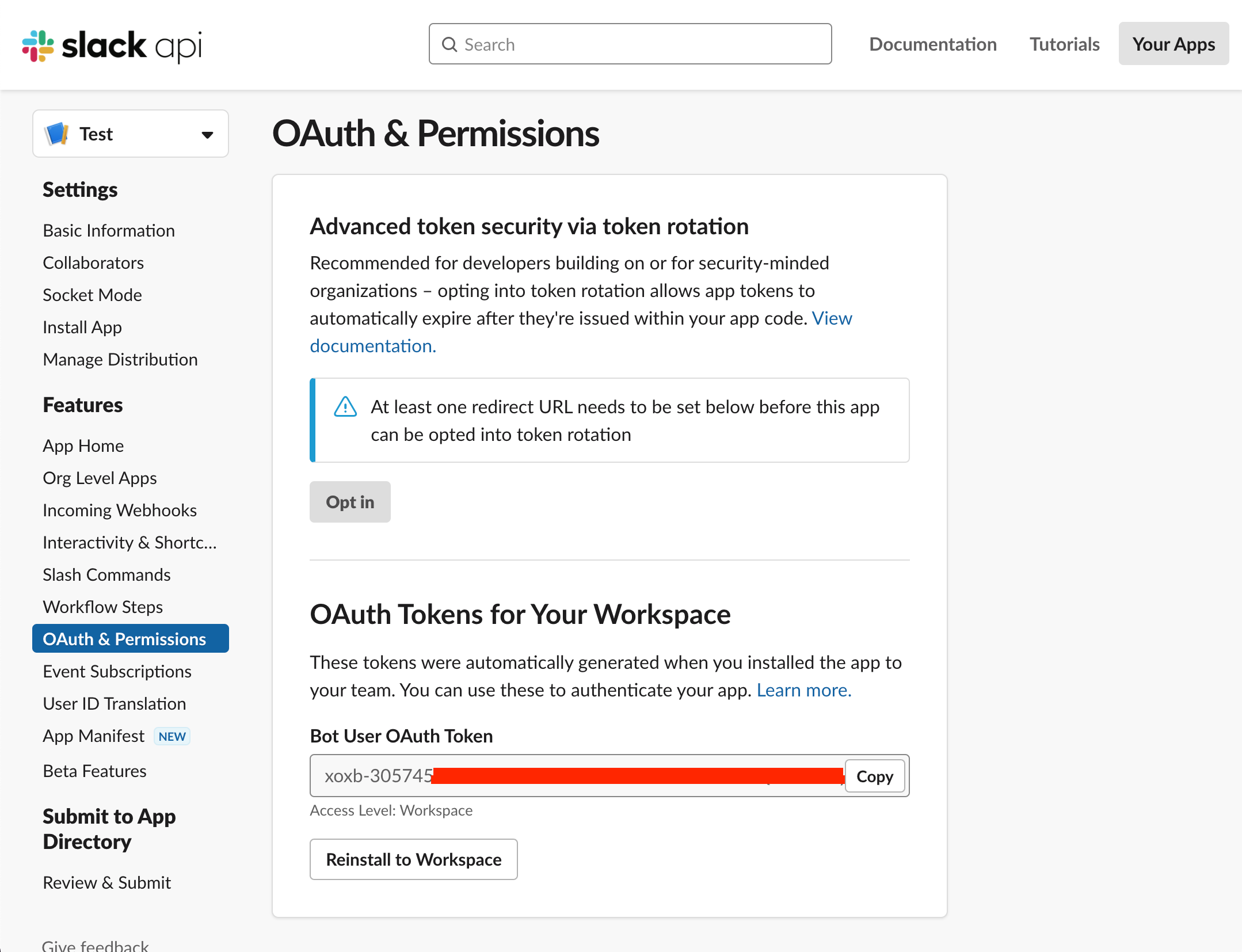 - 이를 활용하여 해당 Woarkspace(나의경우 Test App)와 slack bot을 사용한 메세지 전송이 가능해 진다.