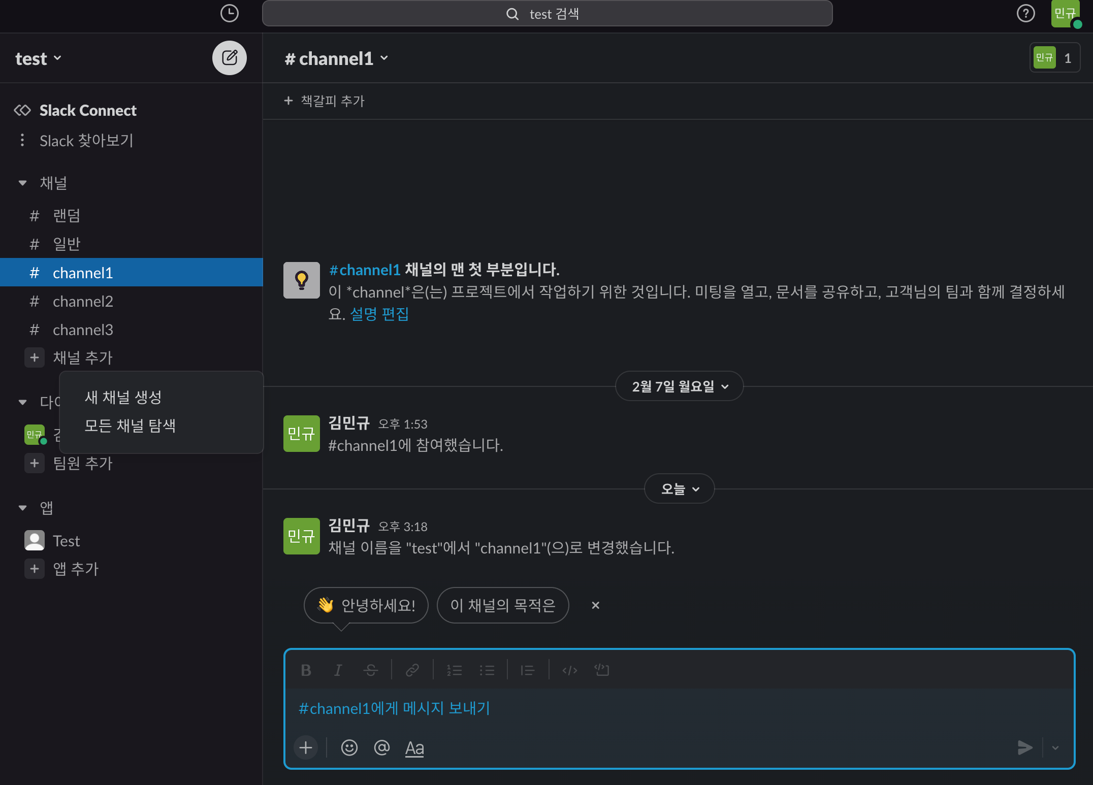 - channel1,channel2,channel3을 만들었고, 만드는 방법은 사진의 [채널 추가] 버튼을 통하여 만들었습니다.