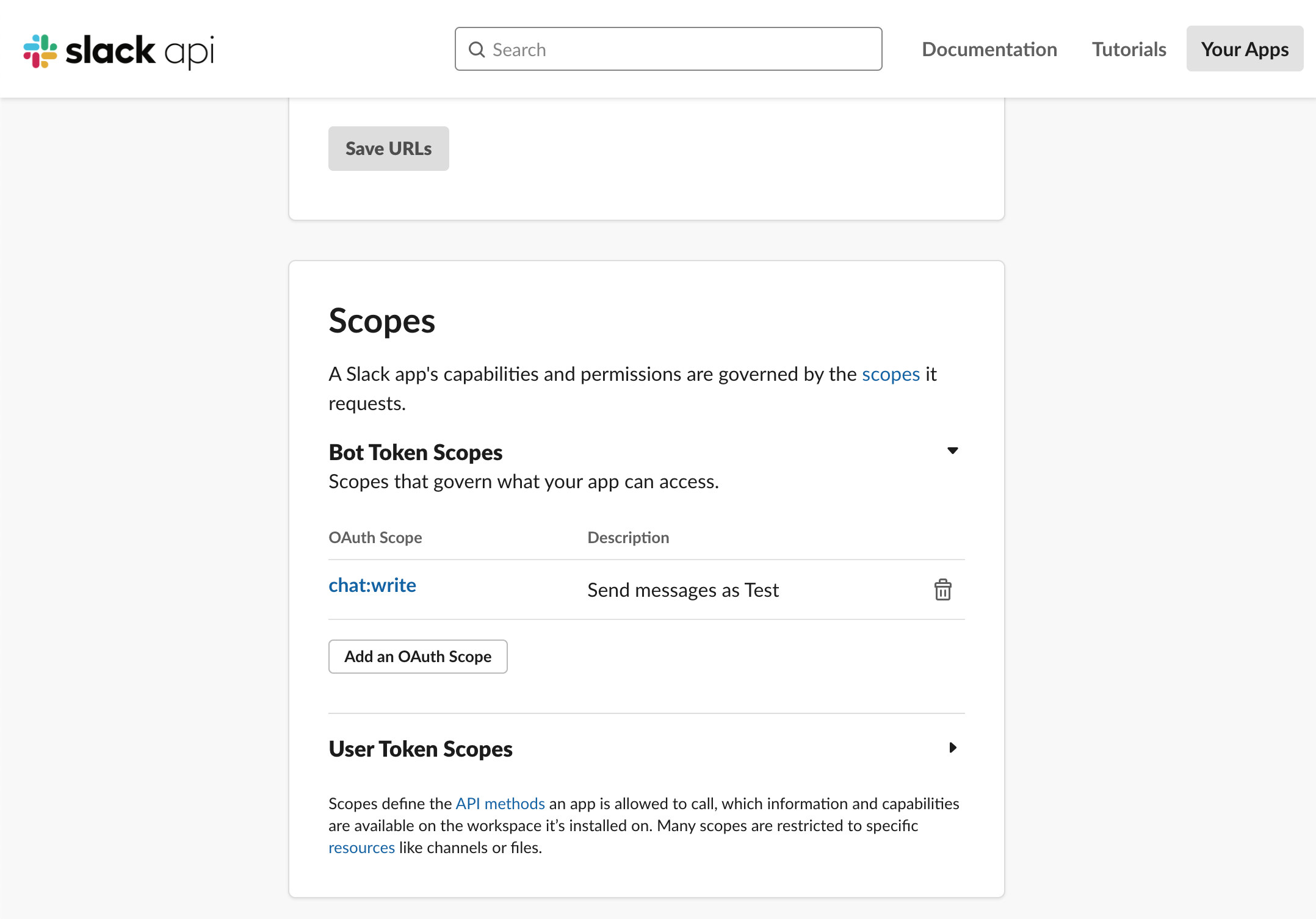 - 봇은 채팅을 쓰기만 하면 됨으로 OAuth Scopte를 chat:write로 설정합니다.