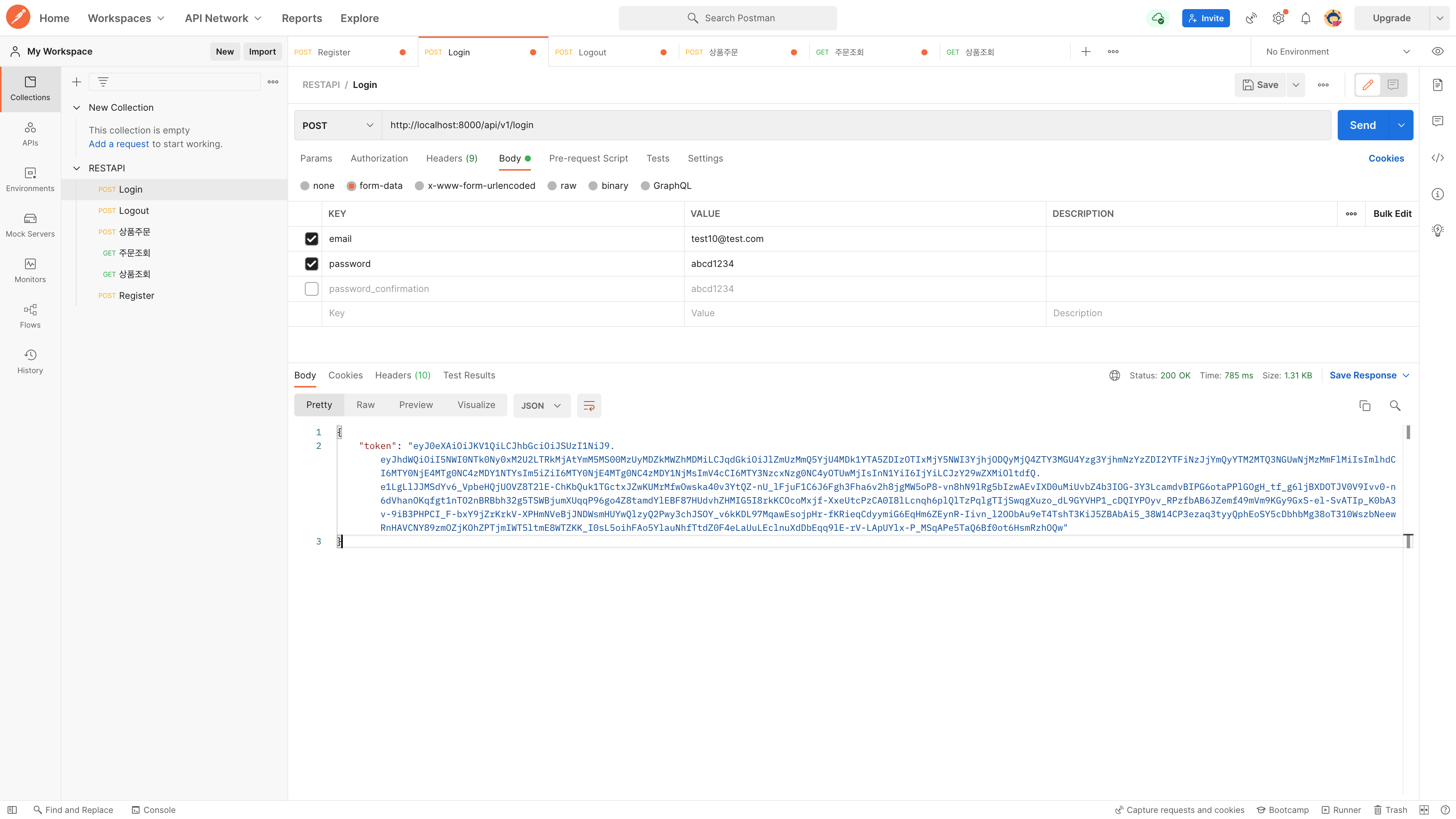 - 회원가입 테스트에서 이용한 아이디와 비밀번호를 form-data값으로 입력합니다.