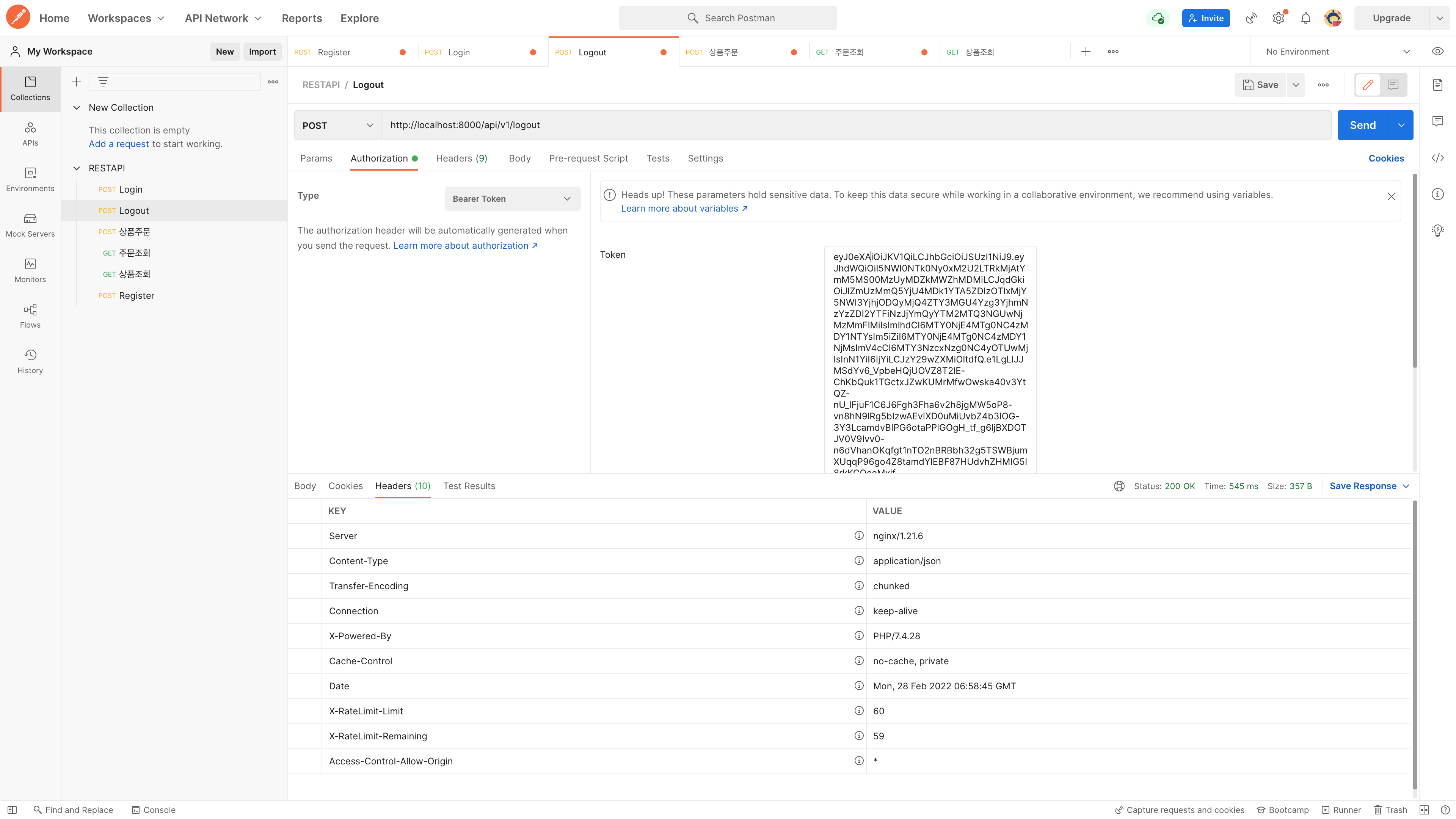 - 로그인 테스트에서 얻은 token값을 복사하여 Authorization의 Bearer Token값으로 넣어줍니다