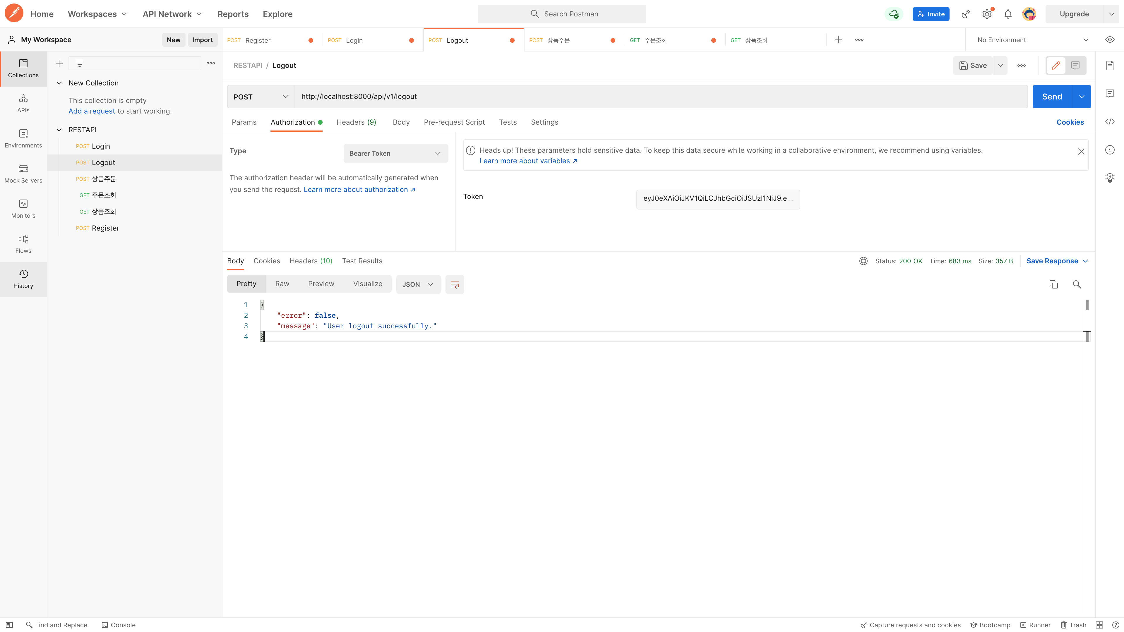 - 로그인 테스트에서 얻은 token값을 복사하여 Authorization의 Bearer Token값으로 넣어줍니다