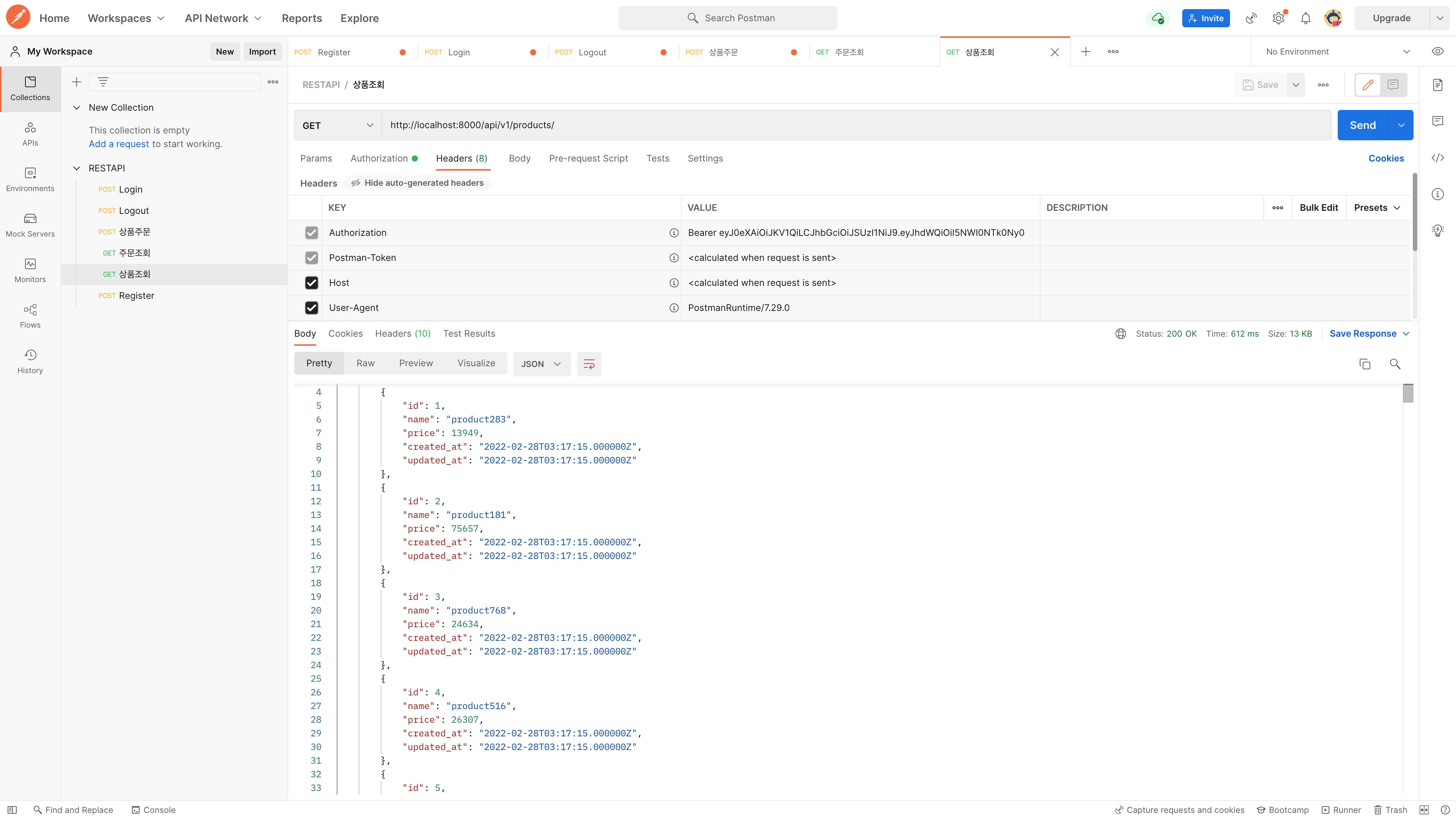 로그인 테스트에서 얻은 token값을 복사하여 Authorization의 Bearer Token값으로 넣어줍니다