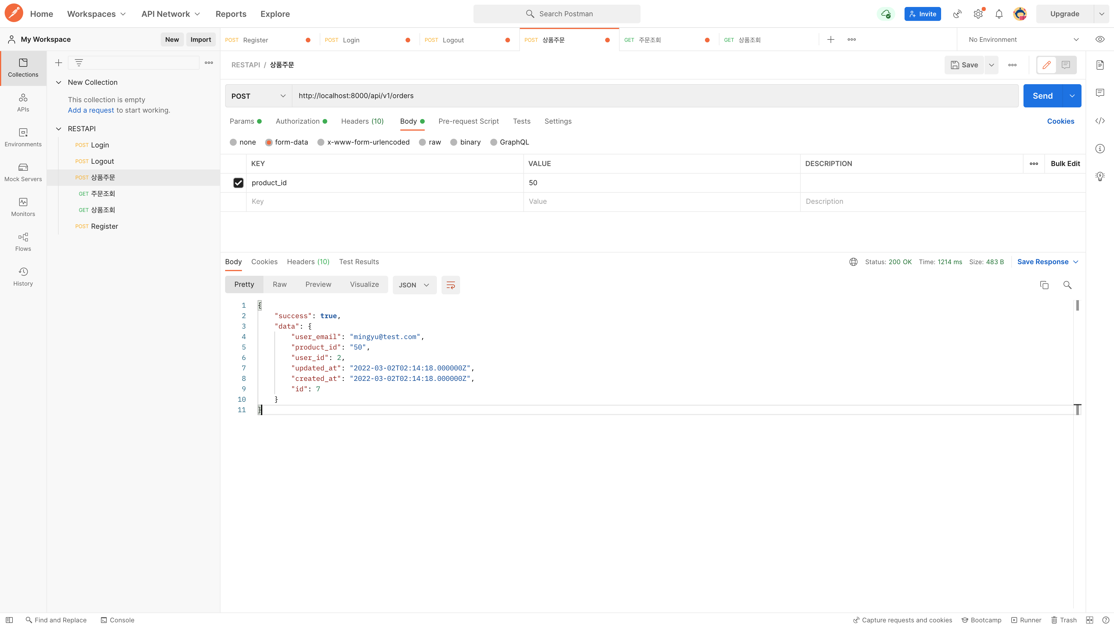 상품 주문에 필요한 필수 값(product_id)를 form-data에 넣어 준 후 send를 보냅니다.