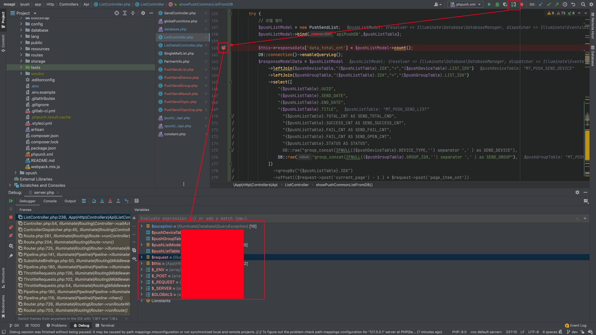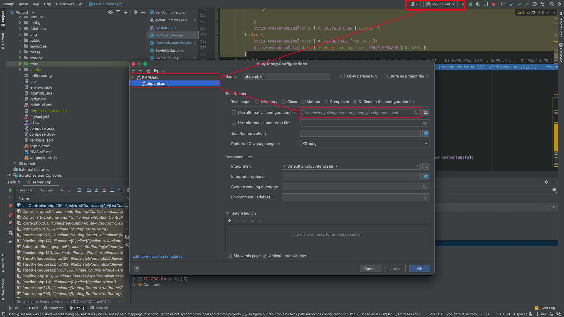 - phpunit.xml 파일을 alternative configuration file로 지정하여 Debug Configurations를 설정합니다.
