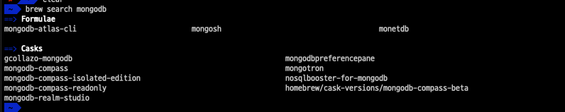 - brew search mongodb 명령어로 설치 가능한 mongodb 관련 software를 검색하면 몇 가지 잘 나오지 않는다.