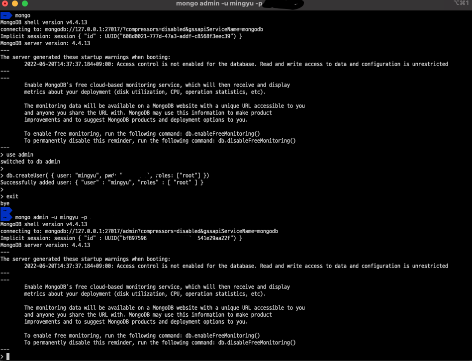 $ mongo admin -u mingyu -p abcd1234