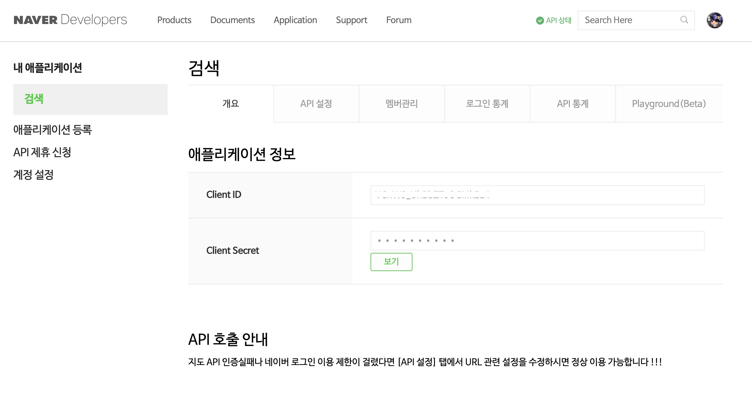 아래 공식 페이지에서 내 애플리케이션 등록을 통해 "검색" 애플리케이션을 만든 후 Client ID, Client Secret 두 가지 Key를 확보한다.