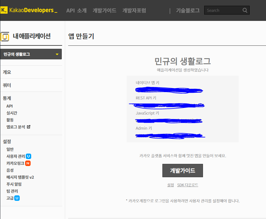 - 3. 아래화면처럼 각 개발 키값이 나오면 앱 만들기 성공!