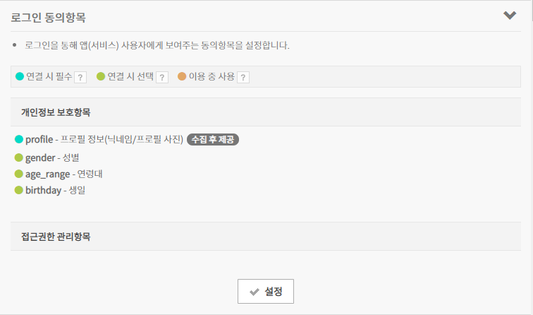 - 2. 로그인 동의항목에서 자신이 취합하고자 하는 항목 ON 활성화 시키기