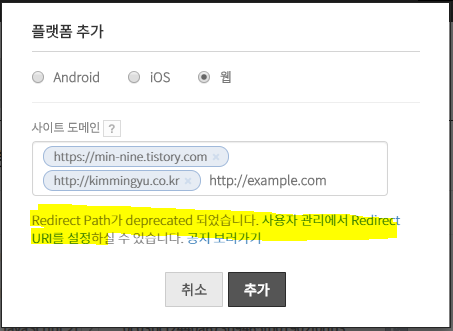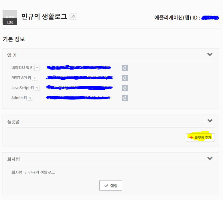 - 앱 이름은 카카오 로그인창에 출력되므로 되도록 회사명과 동일하게 써주는것이 좋다