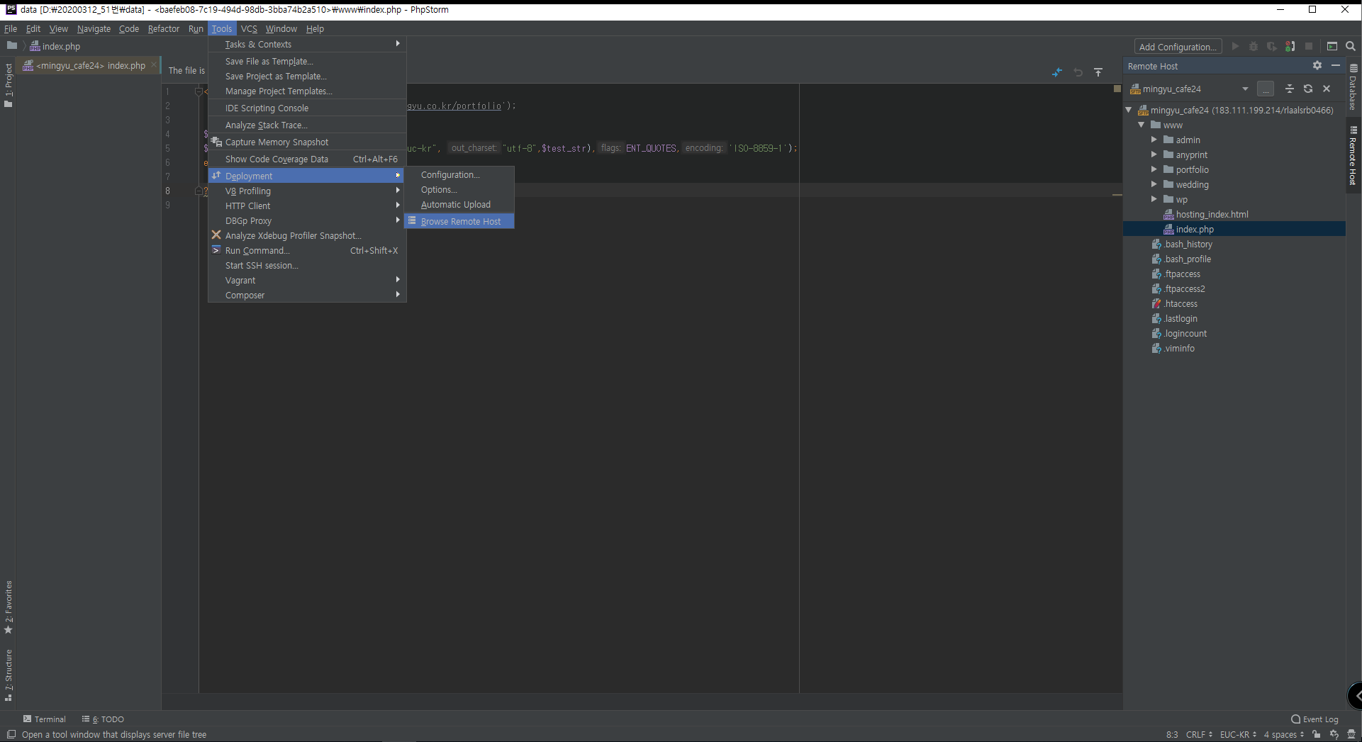 1. 상단 Tools Tab - Deployment - Browser Remote Host 클릭.