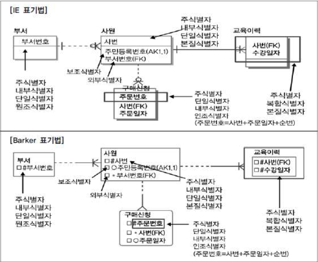 | 최소성 | 주식별자를 구성하는 속성의 수는 유일성을 만족하는 최소의 수가 되어야 한다. | 사원번호만으로도 고유한 구조인데, 사원분류 코드 + 사원번호로 식별자가 구성될 경우 부적절한 주식별자 구조가 된다. |